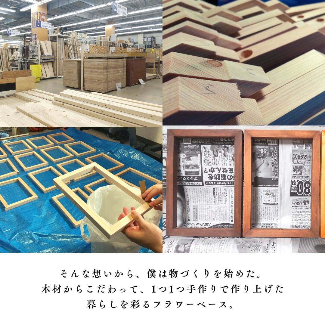透明の花瓶に、質感にこだわって仕上げた木製のフレームを取り付けることで、お好みのお花の魅力をより一層引き立てます。
